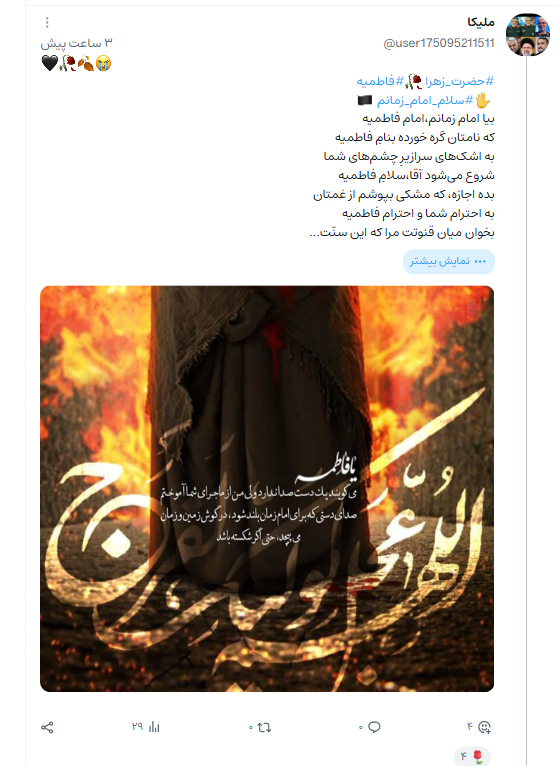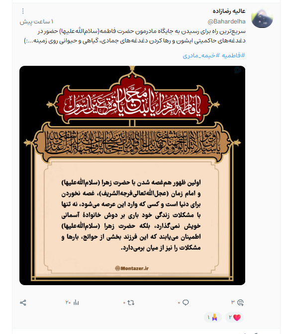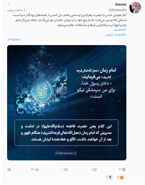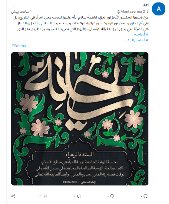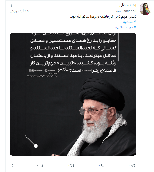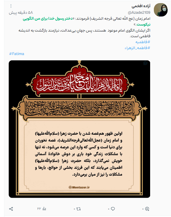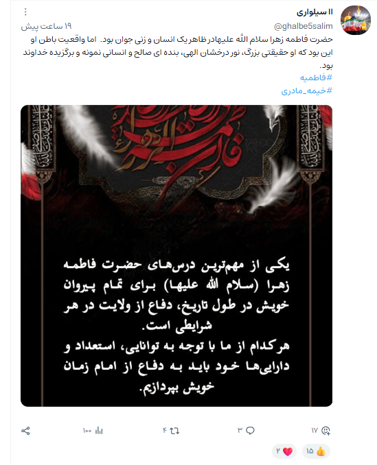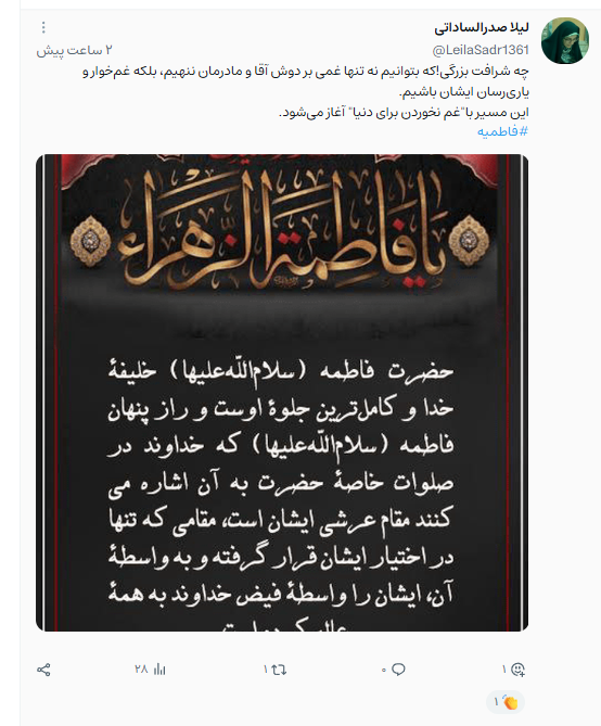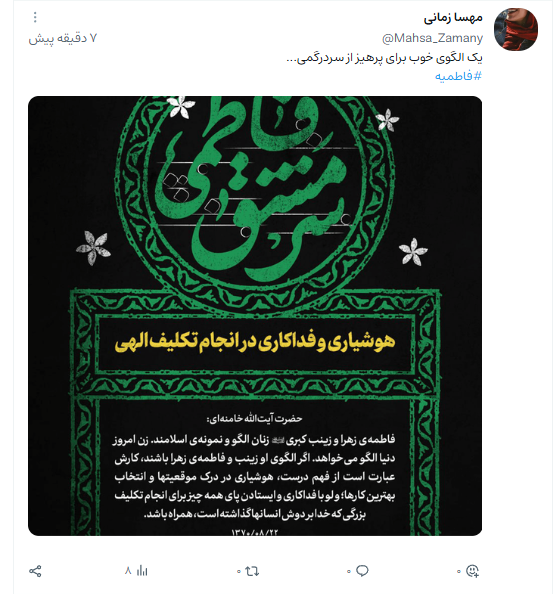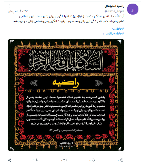 کاربران فضای مجازی نیز با فهم و تدبر در مفهوم عمیق این کلیدواژه مفهومی و ارزشی، نظرات قابل تامل و تفکر برانگیزی درباره الگوپذیری از حضرت زهرا سلام الله علیها به خصوص در ایام فاطمیه را در فضای مجازی مطرح کرده اند که بخشی از آن را در زیر می خوانید: